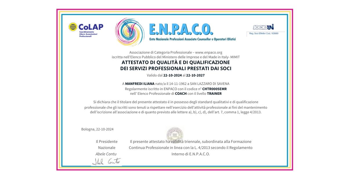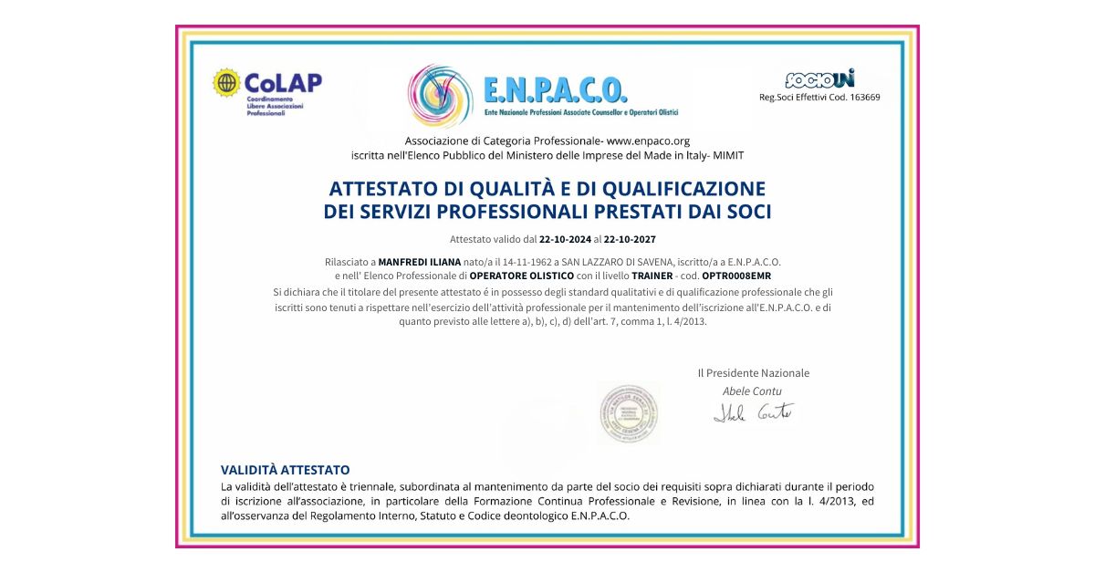 Collaboratrice SIMP (società italiana di medicina psicosomatica) e iscritta agli albi degli operatori olistici trainer accreditati da: ENPACO cod. LLL250000001ILA, secondo la legge 4/2013.